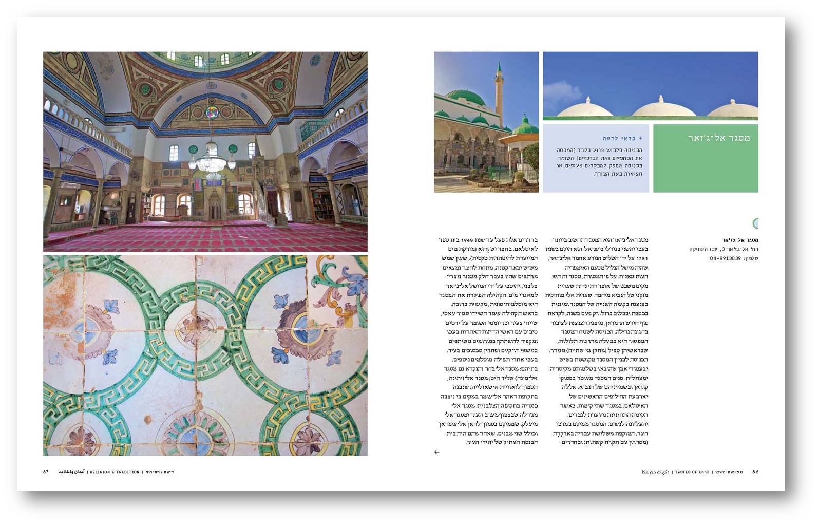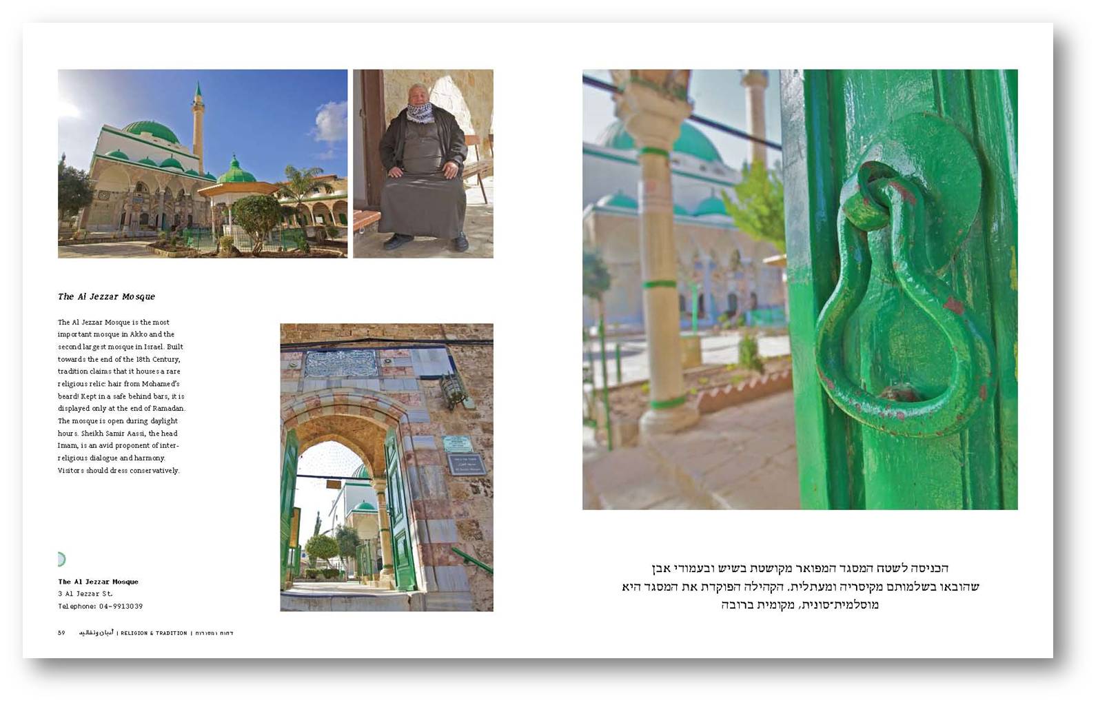 ישן מול חדש, אתרים היסטוריים, טיולים וסיורים בעכו ובסביבתה, הנמל והדייגים, הגן הקסום, אולמות האבירים, מנהרת הטמפלרים, החמאם והבזאר התורכי הישן והחדש, דתות ותרבויות – כולם מקבלים ביטוי בין דפי הספר ויוצרים יחדיו פסיפס של אפשרויות ביקור וחוויה אישית.